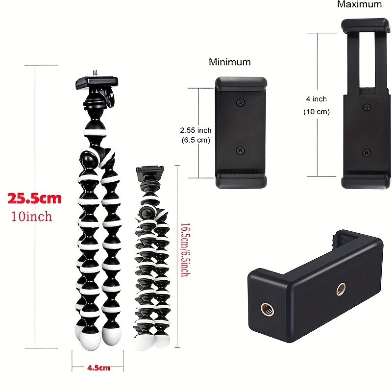 Universal compatibility: Comes with a standard ¼‑inch screw mount and adjustable phone holder, making it compatible with most smartphones, action cameras, compact digital cameras, webcams, and small projectors.